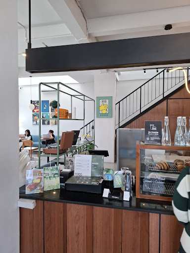 Desain interiornya clean dan minimalis, dengan perpaduan elemen kayu dan warna netral yang memberi kesan hangat. Tersedia area indoor ber-AC yang tenang dan nyaman untuk bekerja, serta area semi-outdoor bagi yang ingin suasana lebih santai. Beberapa meja juga dilengkapi colokan, cocok untuk kerja atau belajar.