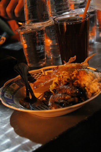 "Nasi campur cumi hitam", In English : Rice with various meat and Hot Sambal, including Squid ink (cumi hitam), beef meats (empal sapi), shrimp cake (peyek udang), Hard Boiled Egg in Bali style (Telur rebus masak Bumbu Bali), Local Soybean cake tofu in Bali Style (Tahu lokal masak Bumbu Bali), They also provide Pepes Ikan tongkol (Skipjack Fish which was cooked using hot and spicy sauces, and steamed on Banana Leaf) All of the menu considered as Hot, Spicy and of course very delicious.