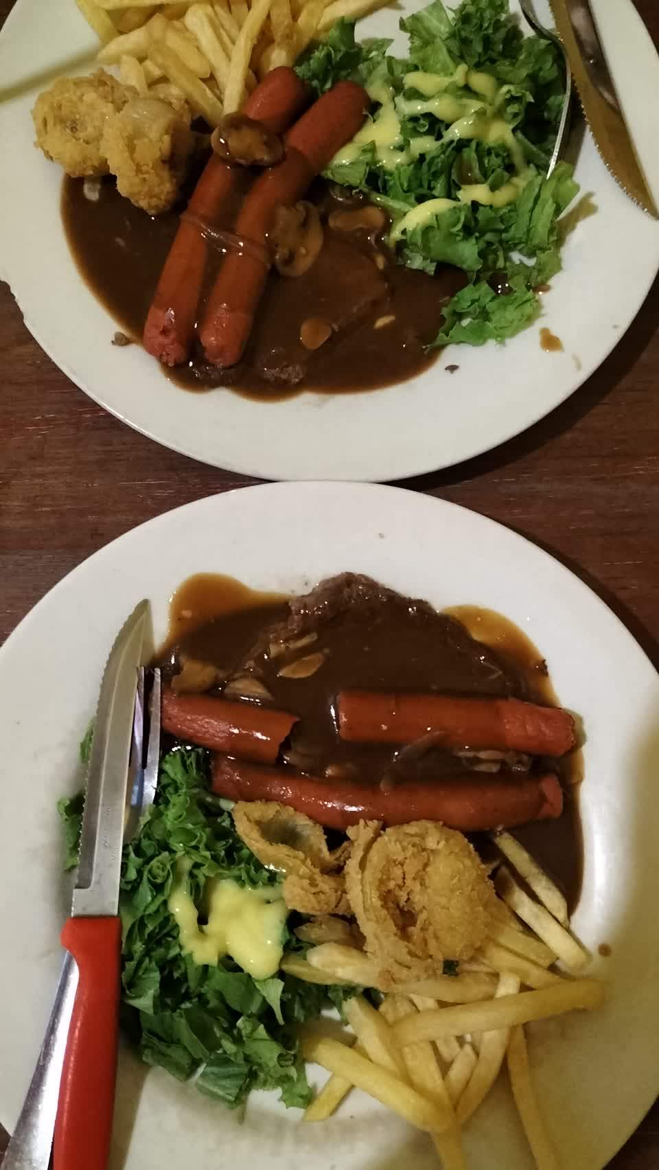 Big BBQ Steak: Meat 4/10 (it's just a thin slice of a meat, even though we ordered a BIG one) Sauce 7/10 (ok, just little bit sweeter in our tongue) Condiments 6/10 (standard canned vegetables) Mashed potato 8/10 (it's good!)