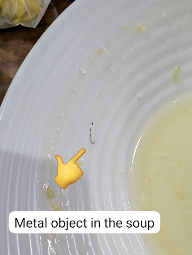 And in the soup I found a metal object similar to the size of a stapler...