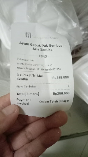 Read moreBarusan saya beli 3x paket tri mas kenthir, di shoppefood tertulis satu paket tri mas kenthir dpt 3 paket dan 3 minum. Harusnya yg saya dpt 9 paket dan 9 minum doang. Tp liat yg datang cm 3 ayam sm 3 minum doang. Halooo 288K masa cm dpt 3 ayam sm 3 minum doang woi. Lain kali dilihat pesanannya yg teliti rugi bgt saya, mana dihubungin susah nomor cs nya, nyesel bgt beli disini ga akan prnh beli...