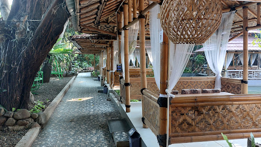 Tempat makan yang indah ini terbagi menjadi 2 yaitu ber-AC dan saung di outdoor. Kami lebih memilih duduk di outdoor walau tanpa AC yang terlihat lebih asri dan estetik karena saungnya berdiri di tepi danau buatan yang tidak terlalu besar. Penataan dan dekorasi dikerjakan dengan sangat serius sehingga terasa nyaman dan tidak bosan duduk berlama-lama di sana, tetapi itu ketika matahari sudah tenggelam, mungkin kurang direkomendasikan di siang terik ya.