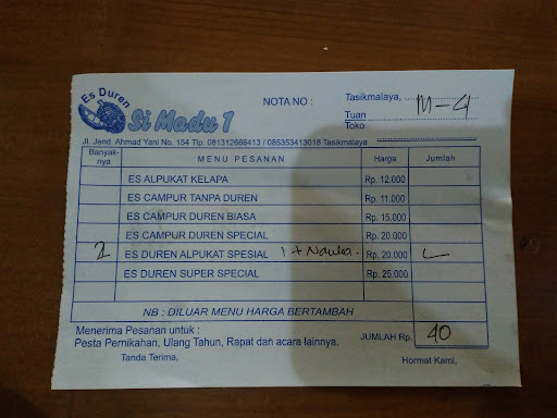 Dulu es Duren madu ini fav keluarga, kuahnya dingin kental manis, es campurnya kumplit, puasss kl panas minum es campur ini rasanya. Tp hari ini sy kecewa dng sajian yg jauh ga sprti dl, yg bnyk hny es nya, manis kuahnya tdk semantap dl, isi es campurnya dikit bngt ga sebanyak dn sekumplit dl, kl dl mantep bngt ada kelapa, nangka, alpuket, agar nya bnyk... tp skrng ko dikit bngt ya, porsinya dikurangin... 19 rb tdk pas dng isi campur yg cm dikit, pelayanannya jg lama bangetttttt, yg baru dateng dilayani, yg udh lama msh bengong aj 1 jam lebih itupun udh dtanya berulang2 br diantar.... apa krn lg lebaran ya rame bngttttt.... kl boleh saran meski rame, tolong dong jng dirobah kualitas dn banyaknya isi es campurnya 😊😊😊 biar ttp mantap es...
