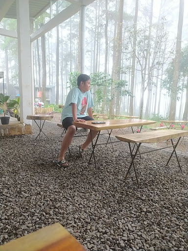 Cafe semi outdoor yg memanjakan mata dengan penampakan hutan Pinus dan orang" yg...