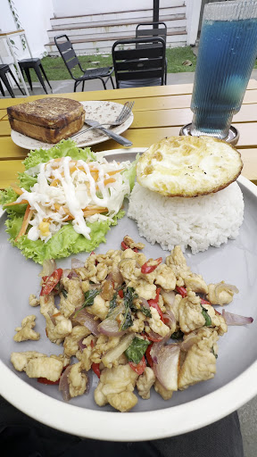 This is my first time visited this coffee shop and my first impression was great.their design and concept on point.i arrived around 12.30 PM and staff ask me what i want and i told her i want lunch and she told me she will ask first if their food ready or not yet,she came and told me that the food will prepare around 10 min and i decided to order Thai chicken basil,choco crunchy toast and shades of blue and i get bill print at 12.37 PM.shades of blue came first and choco crunchy later but my lunch/thai chicken basil served at 13.51 😨😨😨 it took over an hour.honestly the taste was good,unfortunately you can serve as fast as...