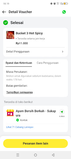 Β Β Β Read morealhamdulillah bisa tuker voucher dengan lancar.. awalnya takut karena baca review nya rata rata bintang satu π tau nyaa aa nya baik tth nya juga baik.. alhamdulillah cuma sambel taichan nya abis yaa gpp masih bisa dimaklum... pas dateng antri.. dan penuh.. tapi antrian cepet ga nunggu lama.. tadi nunggu ada 7 menit an.. semoga ke depan nya pelayanan juga stok makanan nya lebih diperhatikan lagi... semoga berkah seperti nama produknyaa sukses selalu AYAM...