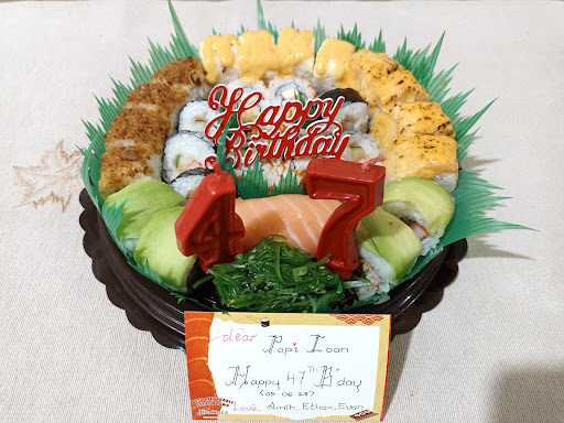 Read morePake Sushi dengan harga yang terjangkau Rasanya juga lumayan enak Hanya tempat nya sempit dan hanya bisa take away... Kemarin beli pake custom Sushi Cake 20cm Lumayan Enak... Boleh lah makan Sushi dengan harga terjangkau... Yuuu...