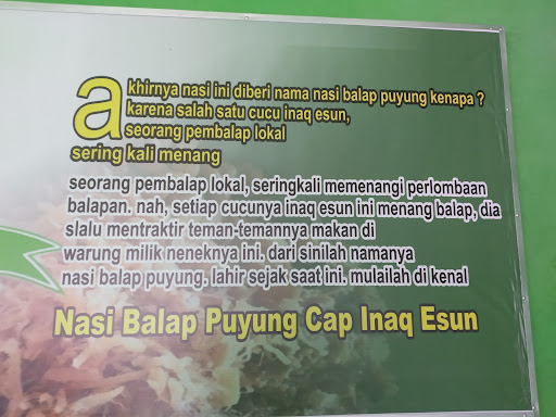 Read moreSaya baru pertama kali mengenal nasi balap yang benar2 di tempat asalnya. Biasanya nasi balap di kota Yogyakarta menurut saya pedasnya sudah bikin keringetan, tapi setelah saya coba di tempat asalnya ternyata terlalu gila pedasnya... Awal masuk ke mulut sudah sukses bikin saya batuk-batuk. Di sisi lain, bumbu ayamnya gurih+benar2 meresap serta teksturnya sedikit keras (mungkin karena dimasaknya sampai kering). Rasanya benar2 nagih bagi saya...dan bikin nangis juga buat ngehabisinnya. isiannya ada kedelai dan ayam suwir yang benar2 digoreng hingga renyah.... lokasinya juga dekat...