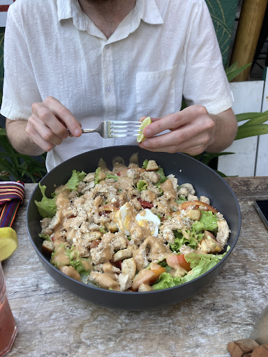 Read moreNice place, and the service is super friendly! We had the pumpkin green curry and the Caesar salad and 2 drinks, and we paid around 300 000 IDR. The curry was very good: tasteful, lots of flavours, big chunks of pumpkin and of onions, and some greens (spinach?). The salad was a bit disappointing, very dry as itâs 85% chicken, 10% bread croutons and 5% salad. It felt more like a chicken breast cut in small than like a salad, the ingredients were not really blending together. For 90k it is also not cheap (although the portion is HUGE). I would recommend removing half the chicken off the salad and replacing it with more vegetables, in order to have a bit more diversity of tastes in the dish. The ginger turmeric drink was very nice. I like that they offer several vegetarian options, and that the straws in the drinks...
