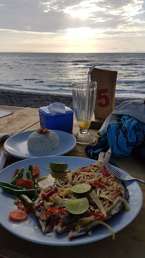 Meal in the sand on the beachfront worth it. Very basic warung, a few tabke and chairs in the sand. ( Toilet was pretty scary) I got the grilled fish in garlic butter sauce with rice and vegies with a fresh mango juice for a bit over 100k idr. See pic . Fish was big, it covered half the plate! , bones in and fresh with a nice topping of onion capsicum and bean sprouts. Vegies were just barely cooked. Home style basic cooking. Young waiter boy just speaks enough English to take order with pointing to menu but can't manage any further questions/ explanation of menu. Another staff ( owner?) was able to speak well but wasn't there the time we went but had spokento him before. Husband had prawns and said it was average and spring rolls were chicken and veg that he said was better. Great view. Like being able to support the local business. Meal was overall 6.5 /10 which is good since we were used to eating at the swanky ( and expensive) western resorts that surround this warung which had left a very...