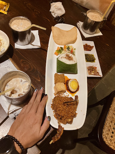 Read more12 Desember 2024/ Mesen nasi lemak beef rendang sama pandan choco kaya. Nasi lemaknya piringnya panjang banget, isinya nasi lemak dibalut daun pisang, beef rendang, acar salad, teri kacang, 1 butir telur rebus diiris, dan ketimun iris dengan sambel di atasnya. Rasa nasi lemaknya subtle, daun pisangnya bikin rada repot sih habis dibuka mau ditaruh mana, tapi untungnya karena piringnya panjang bisa ditaruh di salah satu sudut dengan lauk lauk lain digeser memadat. Daun pisangnya berguna buat njaga nasinya tetap hangat sih. Beef rendangnya ada potongan kentang dan wortel juga, secara rasa sih nggak kayak rendang ya, lebih ke empal balado (?) tapi lunak khas kukus/rebus/presto, bukan goreng. Teksturnya lembut, rasanya gurih manis dengan sedikit pedes, kentang dan wortelnya nambah variasi tekstur. Acar saladnya ada ketimun, wortel, bawang merah, dan selada dipotong bite size dilabur sedikit cuka, sama cherry tomato dibelah dua. Enak buat tambahan rasa dan tekstur. Teri kacangnya standar, manis gurih sedikit pedes dengan mouthfeel alot. Telur rebusnya plain, jadi dibuat partner campuran lauknya yang udah macem macem. Sambelnya nggak terlalu berasa. Pandan choco kaya itu es cokelat dengan krim di atasnya, terus dikasih roti kering manis dengan selai hijau (pandan?). Pretty good tapi sejujurnya tastes like another es cokelat.
