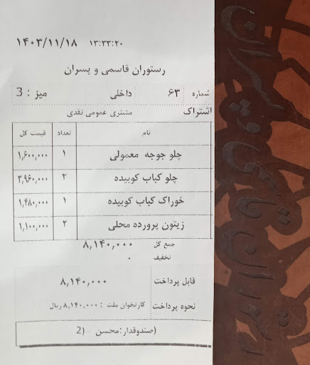 رستوران قاسمی یا همان تعاون قدیم یکی از قدیمی ترین رستورانهای محدوده حرم مطهر رضویه که همینطور که از اسم قدیمی این رستوران یعنی تعاون پیداست قیمت محصولاتش تعاونی حساب میشه. ولی خب بابت همین تعاونی بودن یک مقدار کیفیت غذاهاشون هم معمولی تره. کیفیتش بد نیست ولی خب عالی هم نیست. در قدیم یادم هست فضای رستوران در زیرزمینی با دکوراسیون معمولی و پرسنل اندک و کیفیت غذاها هم پایین بود. اما در حال حاضر رستوران در طبقه همکف است با دکوراسیون مدرن و چشمنواز و جادار تر از سالن قبلی. کارکنان بیشتر و صدالبته کیفیت غذای بهتر از قبل. رفتار پرسنل بسیار عالی. سطح بهداشت و نظافت عالی. سرویس دهی خوب.