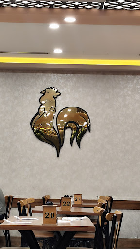 The golden rooster branding element adds playful character that balances the sophisticated interior design, suggesting a restaurant confident enough in its quality to incorporate memorable visual elements without compromising elegance.