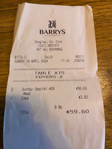 Read moreIf you have food algeries . . you have to ask the server if the food item that you cannot eat is in the food as it does not tell you on the menu. . The dinner menu has garlic & onions in everything. We paid €33 euros for the steak. . It was only the steak . . Nothing else . . Which we could not have even the pepper sauce . . As the server told us it had one of the ingredients in the pepper sauce that my son was alegeric too. . I must say . . My spare ribs were delicious . . When I paid . . I said it to the young lady . . The reply back . . We must look into that & as other people then your son would also have food algeries . . I did reserve the table . . They had my name & phone number . . . But no contact was made by them to me . . . They should follow up . . Other resturants have food containers on the bottom of the menu . . Or. . Besides each food request on the menu. . . We we order something on the menu & did not ask the server. . I would hate to see the reaction by son would have add. . . Please beaware Barry's of people who have food alergies & please the state the contents of them in your menu . . Like other...