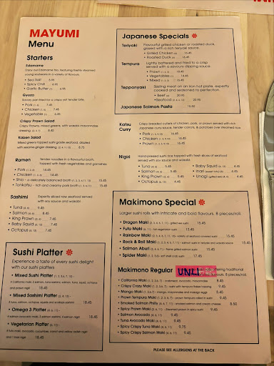 We are big fans of their take away sushi which we always bought from Sensei restaurant, the other store they own close to the Mercy Hospital. Our experience has always been outstanding and we were excited to try the all-you-can-eat option at Mayumi Restaurant on Sunday at lunchtime. The location is excellent but as soon as we walked in we realised that the premises were not heated at all. We were 4 adults and a 2 and a half toddler. Apart from being quite cold there was no background music playing and the environment was not warm and welcoming. From the menu we saw that there was a very limited all-you-can-eat sushi selection but we decided to give it a go and go ahead with the order. All of a sudden the electricity went out and it triggered an alarm that went off in the entire room. None of the staff, not even the owner, was able to turn it off. An electrician arrived after 15 minutes and then other two colleagues joined him but no one could take any action. Meanwhile, the first order took over 30 minutes to arrive, the second round another 30 minutes. They brought us a different wine (red) than the one we ordered saying no fresh white wine was stored in the fridge. We spent an hour and a half with the alarm that kept going off without the staff or the electricians being able to intervene. The owner was genuinely petrified and apologised to the customers, we really appreciated that, however we were not offered any complimentary food/drink/dessert as a good will gesture to make it better after the horrible experience nor did they even think of applying a little discount to our bill. Even small things can make a huge difference, we didn’t feel valued. When we were at the till the alarm eventually stopped…it turned out to be a faulty Eat It appliance for the take away orders. Our lunch was supposed to be a well deserved treat after an extremely hard week and it converted in the worst nightmare ever. We’ll still order take away sushi from Sensei but we’ll definitely stay clear from Mayumi as service was...