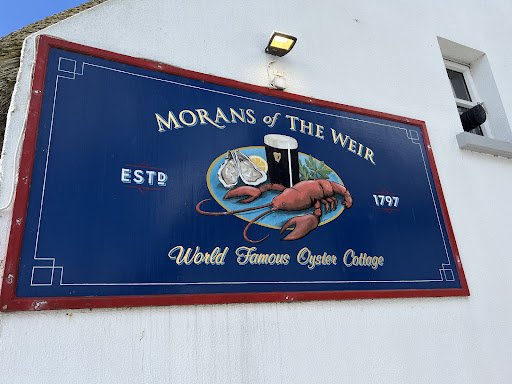 When driving to Moran’s from Galway, you will miss the first sign and right hand turn, just in time to see the second sign. Please turn right, through the narrow pass (even for Ireland’s west) over the stone bridge, and along the windy bank-side road. You’ll know when you have arrived, by the number of cars parked wherever they can, and you’ll join the lot.