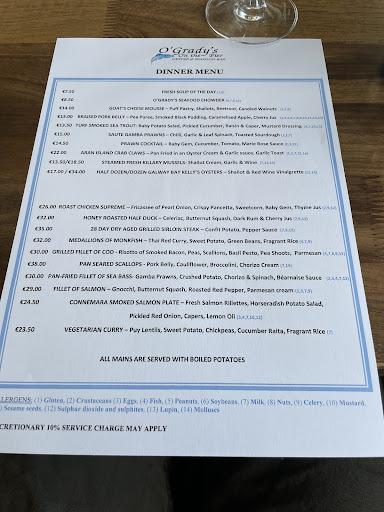 Read morewe visited o'gradys pre covid and the food and service was exceptional, sadly on this occasion the service wasn't, through no fault of the staff on duty themselves just required more on duty, the welcome was good, we love the decor and the ambiance, firstly the menu's we were presented with were photo copies not good for a restaurant of this standard, the wine list consisted of wines complimentary to the menu, a shortened a'la carte but quality,the presentation and food quality was second to none, we had the pan-fried prawns and the feuilette of chickens for starters, medallions of monkfish and the sirloin steak for main courses, absolutely delicious, we ordered a bottle of wine and also wines by the glass, the restaurant was full downstairs and also upstairs where we were seated, there was only two staff upstairs, they did their best but for a restaurant of this standard it was sadly lacking, I mentioned it to the manager and he agreed also said they cant get staff, we had to pour our own wine and if I was looking for a staff member I had to get up from my seat and look for one, our bill was around 130 euro no desserts, if I'm spending that money I deserve a professional level of service, o' gradys have some soul searching to do, I would have expected linen napkins,either revert to a bistro style or get properly trained waiting staff, we were disappointed and won't be returning in the near future or recommending, jim and Jackie O'Connell, 5 star for food 2...