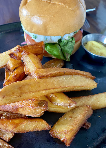 🍔 Prawn & Cod Burger - Charcoal Baby Gem, Tomato, Pickled Red Onion, Home Cut Fries, Curry Aioli.