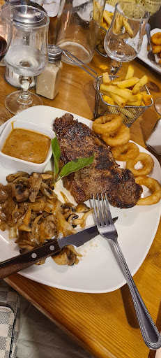 I was here with friends on a weekend and the area we sat in was spacious and near the front. For starters, I had the soup of the day (creamy veg) and we were given a mix of white and brown sharing bread. For mains, I had steak with sweet potato chips, onion rings, sauteed onions, mushrooms and pepper sauce. The steak was huge and perfectly cooked. The portion size was huge so I didnt have room for dessert!! The red wine and coffee were also delicious. The staff were attentive and everything was reasonably priced.