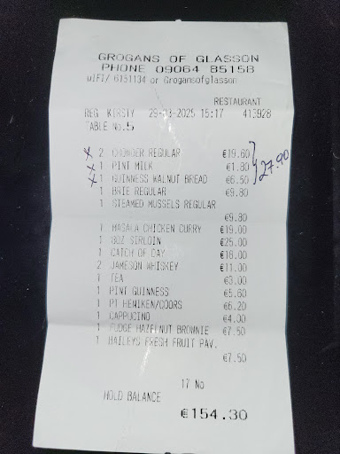 Myself and 2 lady friends booked a table at Grogan's on Sat 29th March for an early Mother's Day treat. All went well even though place was busy and service was not as good as expected from previous visits. Bill was paid in full not split in 3, got the receipt without checking it. A day after I looked over the receipt and realise we were overcharged by €27.90 , see bill below. The 3 of us ordered 2 starters to share (we got charged for 6 items on the starter section instead of two, 4 lil slices of bread was brought to the table without us asking for it and we got charged €6.50 for it) 3 mains, few drinks and 2 desserts to share. CCTV was directed at our table so it is easy to check. Afterwards i ve rang them and let them know about the situation and requested a refund ofcourse (i was ready to accept a voucher for that amount to spend it in there too). I was told the manager will contact me shortly, no one rang me back and now they are not answering my calls. Such a pity...shameful for your business to deceive and scam your customers...Bad bad form for €28... So yes, whoever reads this review please check carefully your bills at the end, it seems they are not very honest and trustworthy...