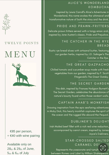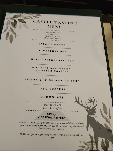 Read moreThe deceptively simple appearance of the 12 Points restaurant gives no hint of the wonderful dining experience which follows. Lunch transformed into an aesthetic ritual that is much about flavours as it is about conversation, served by careful and attentive staff who graciously introduced each course as it arrived. Our lunch started with beautifully presented amuse bouche, almost too pretty to eat. These were followed by the most delicious sugar snap pea veloutĂŠ and later by roasted pumpkin with blueberries in the shape of a heart (in honour of St Valentine). We then had a piece of lightly smoked trout and celeriac in cedar oil and for pasta Killua Irish Moiled Beef Ravioli in beef broth âthe best dish of the day. The main course of loin of venison from the Killua estate was perfectly cooked to medium and with its accompaniments, perfectly balanced. To finish there was two deserts, raspberry followed by a mixture of different chocolates, one introducing the other. Finally the last but not the least the most delicious petite fours. For foodies, 12 Points is a treasured place because almost everything you eat comes from the farm and garden of the castle. The meat from their own herds of deer, the herd of Irish moiled cattle, the Jacob sheep and wild boar all ensuring the...