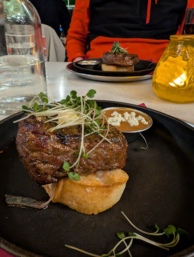 Here’s what we had; Starters: mushroom toast- one of the best we have ever tasted, absolutely delicious no fault + chicken wings (on the bone)- quite spicy but very flavourful and texture was lovely Mains: Moules-frite- these were enjoyed by our gluten free guest, they were originally brought out with bread on top (although they were requested to be gluten free) however this was immediately rectified by apologetic staff and a fresh meal was brought out- mistakes happen in a busy restaurant and this was no problem for us Steak: 1 ribeye and 1 filet mignon, steak was gorgeous, generous portions, I will say ribeye was rare instead of medium-rare but it was enjoyed all the same Sides: truffle fries, broccoli, corn on the cob, onion rings- all 10/10 This may be opinion based so no points taken but blue cheese mash was very overpowering with blue cheese flavour without being able to taste potato almost at all Desserts: baileys crème brûlée- absolutely delicious would highly highly recommend