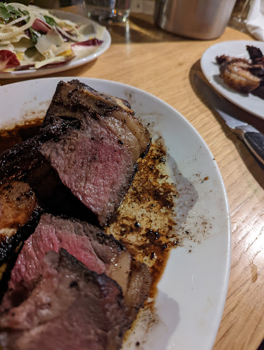 Food... not as expected. The first cold course was good, except the bread was also served refrigerator cold. The two pasta courses were very small, only one ravioli per person. The ravioli was too thick. The pumpkin filling was almost completely lost. The ragu course was better, but not by much from a serving size stand point. The flavor of the ragu was excellent. The main was ribeye served with salad and potatoes. This was the best course overall. Good char on the steak and it was flavorful and cooked well. Unfortunately, the steak we received had several strings running throughout, and this made it less enjoyable. The dessert course was a miss. The ice cream of the affogato was overpowered by the espresso. We asked a neighbor about their dessert, cheesecake, before ordering ours. Their reply, "skip it and stick...