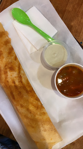 Dosa is a savoury crepe made from a batter of rice and lentils, served with a kind of vegetable gravy / thin soup and a peanut chutney, which is not sweet, but actually very spicy. If you've never had a Dosa before, get a Masala Dosa: it is filled with mildly spiced buttery potatoes, and it's got to be one of the most delicious things on our planet. I honestly feel sorry for anyone who hasn't tasted a Masala Dosa. There's around a dozen other ones you can get here, and they're all great, but the Pav Bhaji Dosa is another particular highlight, with a beautiful vegetable curry filling. Dosas are all vegetarian, and are gluten-free.