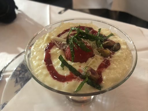 The starters were nice, decor is as youâd expect for a pricey restaurant (lovely) and we went for the recommended wine which was very good. Ambiance was ok although at one stage a junkie was at the table beside us begging for about 6 minutes before the staff noticed and moved her on. Not something you want while eating.