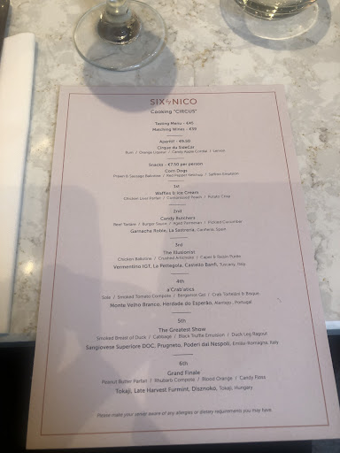 Our whole experience was just ... terrible. I dont have words to describe it. Me and my husband like to do menu tastings all over the world when we travel, and tonight we decided to visit Six by Nico because it was on the Michelin list. We sat down at 7:15 pm, a lovely couple was sat next to us soon thereafter. They got menus and complimentary champagne ... we did not. Our server was walking around doing everything else, but not coming to the table. Finally we get our bread/butter and first course from a different server (champagne later). Our server comes by and introduces himself (tall, red head guy - he likely mentioned his name but it was very loud and difficult to hear) to both tables at the same time.