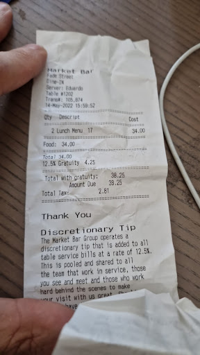 Ā Ā Ā Read moreMe and my girlfriend had lunch at Market Bar and our experience was not great. First off, we were asked to sit on a table of 6 with 4 other random strangers, when the whole venue - which for anyone unfamiliar is fairly large and certainly capable of more than 70 other seats - and was mostly empty at the time we visited (around 3pm) which makes very little sense since in that this is happening short of a pandemic. Nowhere on the menu does the "lunch portion" say the portions are smaller than the regular "hot plates" portion, so we assumed the lunch menu would be enough and much to our disappointment, our dishes were all so small we both came away hungry from the restaurant. The meatballs that once used to be a sizeable portion were now only 4 meatballs, the calamari had bits that were just the batter without the actual fish but otherwise were remarkable. The potatoes were oily and had certainly been cooked hours before as they tasted redone -- we left them entirely, and the chicken wings were just an underwhelming portion but decent otherwise. Each lunch menu had also a starter of bread with two dips, but only one serving of bread was given and we had to request the second serving. So overall, from the main menu, 2/4 dishes were decent. When the bill comes (see attached picture) it states the bill including a gratuity comes to 38.25, but if you don't wish to pay gratuity they would need to call manager. So, considering the experience and the food was pretty not recommendable, I didn't feel a tip was in order and asked to pay without leaving a gratuity, though I did not feel like reprimanding the service because apart from being the usual slow and trying to pack us with a group of 4, they didn't do anything note-worthy causing me to bother with a review such as this or not returning to this restaurant. The staff called the manager who promptly came by with the card machine. He unblocked the contention around the tip straight away, by proceeding to take the payment, which was superb, but the awkwardness ensued when, despite the "cumbersomeness" of having a manager mediate a tip-less payment, he showed zero interest in why we did not wish to leave the tip already included on the bill - not even in whether we enjoyed the food or the service, absolutely nothing. This clearly shows their interest does not lie in improving their service, it's only to create a subterfuge to dissuade customers from refraining to pay less than the included gratuity. We were both customers since 2008. This is no longer a restaurant we will be using or recommending...