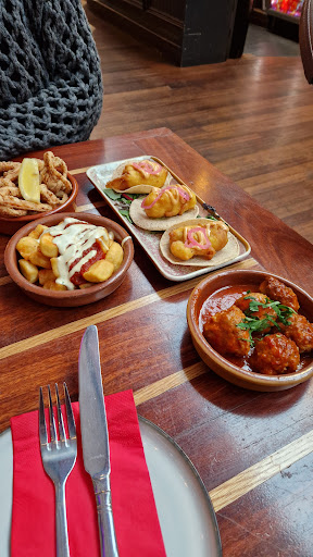 Drinks were very good we had a P*rnstar Martini and an Aperol Spritz. The patatas bravas were absolutely delicious definitely go for those, the croquettes had great unique flavour but were essentially liquid inside, the caprese was good, the tuna tartar was delicious and nicely seasoned (though we felt it needed some sort of vessel on the side like a wonton or rice chip), the chorizo al vino and goat cheese dip were also delicious but the bread served with it was surprisingly awful. It was simply pre-frozen (I assume) untoasted sliced sourdough baguette and added nothing to the dishes it was served with. I was expecting, especially for the price of the dishes, either grilled sourdough or higher quality sliced sourdough from one of the many amazing bakeries the city...
