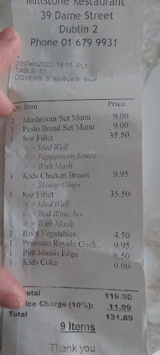 Read moreMillstone Restaurant on Dame Street is an absolute gem in the heart of Dublin. Stepping inside feels like entering another era, where old-world charm and warmth wrap around you like a welcoming hug. From the elegant stone walls and warm wood accents to the ambient lighting and cozy atmosphere, the setting is both timeless and comfortable, perfect for a special family occasion.