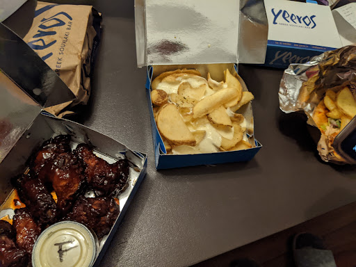 I don't eat meat but was delighted to see so many exciting vegetarian options, which can sometimes be a little boring - certsinly not the case with Yeeros. Their vegeterian Gyro options all sounded so tasty that it was hard to choose one. I went with the Athens pita wrap. This has all the usual gyro fair - chips , tzatziki tomato, onion, and chilli sauce but the crazy factor is the zucchini fritters! (also known as courgette fritters) They are normally a starter so when I saw they were in the wrap I was like woah, now I've seen everything!