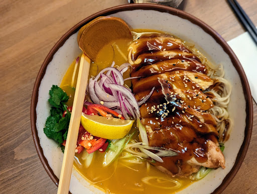 The unassuming facade opens into a quite traditional Japanese sushi/ramen bar, buzzing with chatter from the many folks who clearly know and love it. Plates of gyoza, sushi and kara age looked tempting, as did the sizzling donburi bowls, but in the end I stuck with kimchee chicken ramen and it was absolutely delicious. The broth flavourful and salty (in the best way), the chicken tender, the noodles cooked to perfection.