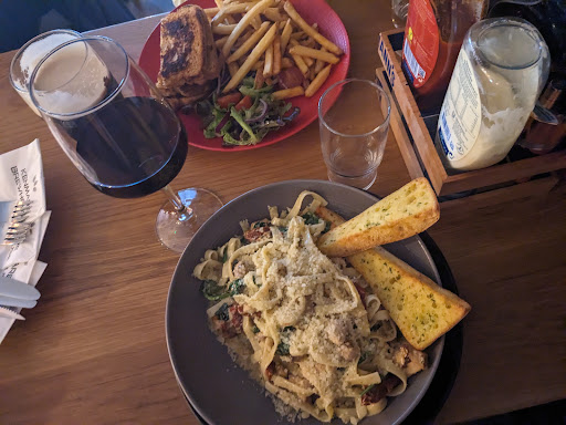 We just happened to notice that this bar had booths, which kept my dad separate from others (being safe due to his cancer) & the space felt well aired. Plus, it looked clean. T'was a bit cold for him, but he was happy enough to leave his hat & coat on as he felt quite safe eating there. On the specials board by the entrance, I spotted the steak ciabatta with side salad & chips. A new lad brought us menus. I checked out the rest of the specials menu. The young waiter returned to our table, moments later, to take our order.