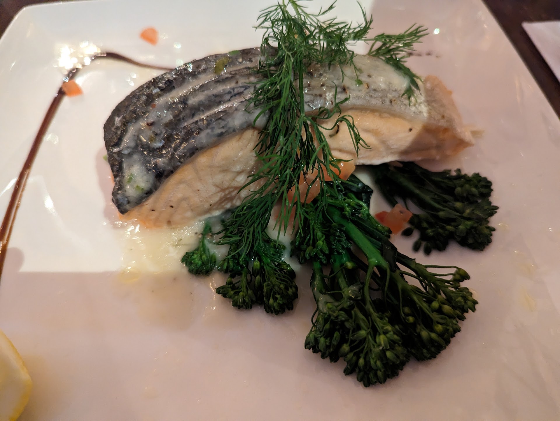 Our bread rye with butter were already on the tables and our first course of Seafood Chowder was served promptly. It was deliciously cooked with mixture of salmon chips and clams. Rarely would I finish entire bowl of starter soup, and this meal was exceptional. I cleaned up the entire bowl with the rye bread.