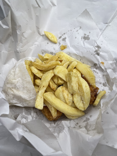 Had Whitting in batter, chips and a coke, all for seven Euros. Served wrapped to takeaway...food was hot.