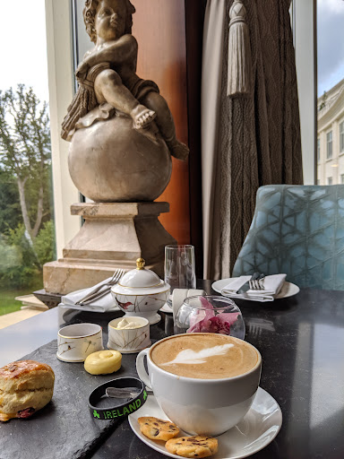 This lounge is gorgeous, it's inside the Powerscourt Hotel on 4th floor. You don't have to be a hotel guest to go there. They serve breakfast till 10am and lunch starts from 12pm. In between, you can get a beverage from their selection. They also have a menu for beers, wines and other alcohol drinks. I was here for a work event and went around 11am to the lounge and ordered a cappuccino and fruit scone. The coffee was great and scone was fresh and super tasty, served with a spread of butter and jam. They were nice to accommodate my request for half a portion. Paid around 8 Euros for a coffee and scone which isn't bad for the luxury hotel this is. The lounge has a great view of the outdoor gardens if you grab a window seat. Light music playing to set the mood right in the morning. My server was super...