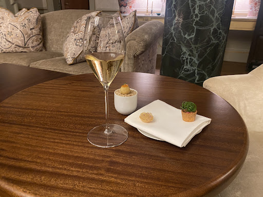 Started out in the parlor where I was served a glass of champagne with canapés (Beef tartar with chives, Pickled apple, Pig head with potato).