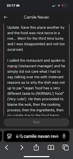 I called the restaurant and spoke to manaj (restaurant manager) and he simply did not care what I had to say, talking over me with irrelevant reasons as to why the dish was not up to par “vegan food has a very different taste to (NORMAL!) food” (Very rude!). He then proceeded to blame the wok, then the cooking process, then the ingredients, then my palate due to the food being vegan and apparently not normal food. then he went on to say his meat is fresh meat even tho I had no issue with meat.