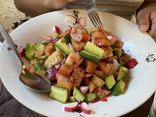 Read moreWhen it comes to eating out, there are two things I typically do not do. First is eating at hotel restaurants, which tend to be overpriced or touristy; and second is repeating restaurants, as I’m always looking to try something new. But I broke both of these rules for Azzahra, an old, classic hotel in East Jerusalem, where I ate at years ago during my first visit to the city. The Palestinian specialties are the items to order (ignore the international menu sections), and we started with the Balilah, a traditional countryside salad made of chopped parsley, mint, onions, tomatoes, bulgur, and chickpeas in a very lemony cumin dressing. I also had the kibbeh (fritters stuffed with ground meat) and filo cigars stuffed with meat as two fried appetizers, but the best starter was definitely the hummus, a super creamy chickpea-tahini purée topped with chickpeas, olive oil, cumin, and chopped herbs, and served with a plate of pickles, chilies, and olives, along with puffy rounds of pita bread, freshly-baked in their pizza oven! The hummus was served slightly chilled but still creamy and flavorful; the pickles weren’t too salty, and the chilies added a nice spicy kick, but nothing beat the hot, fresh, steamy pita bread.