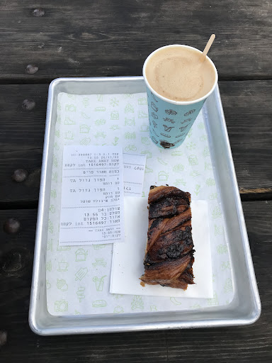 We went in for lunch, but because of the prices I ended up having coffee only. My friend had coffee and a piece of cake. It was Shabbat and there were long lines to order (on touch screens).