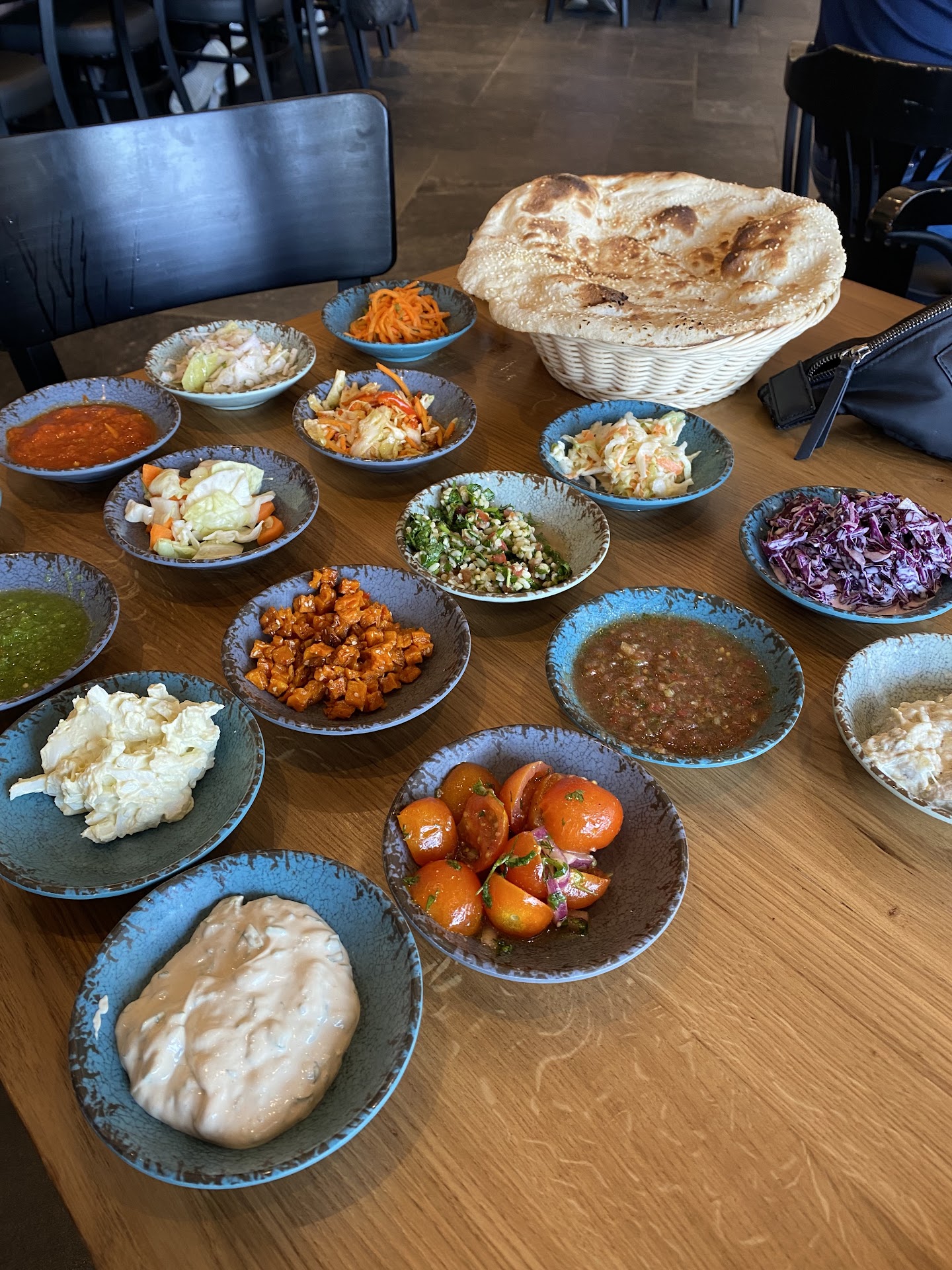 I chose two skewers for my main course, pargit and chicken wings. The skewers each had generous portions of meat, soft, tender and tasty, cooked on a coal grill. My wife, who eats much less than I do, had the breaded cauliflower starter as a main course, from the many vegetarian options on the menu. Our young grandson, who likes his food simple, had a hamburger without any trimmings, just the way he likes it.
