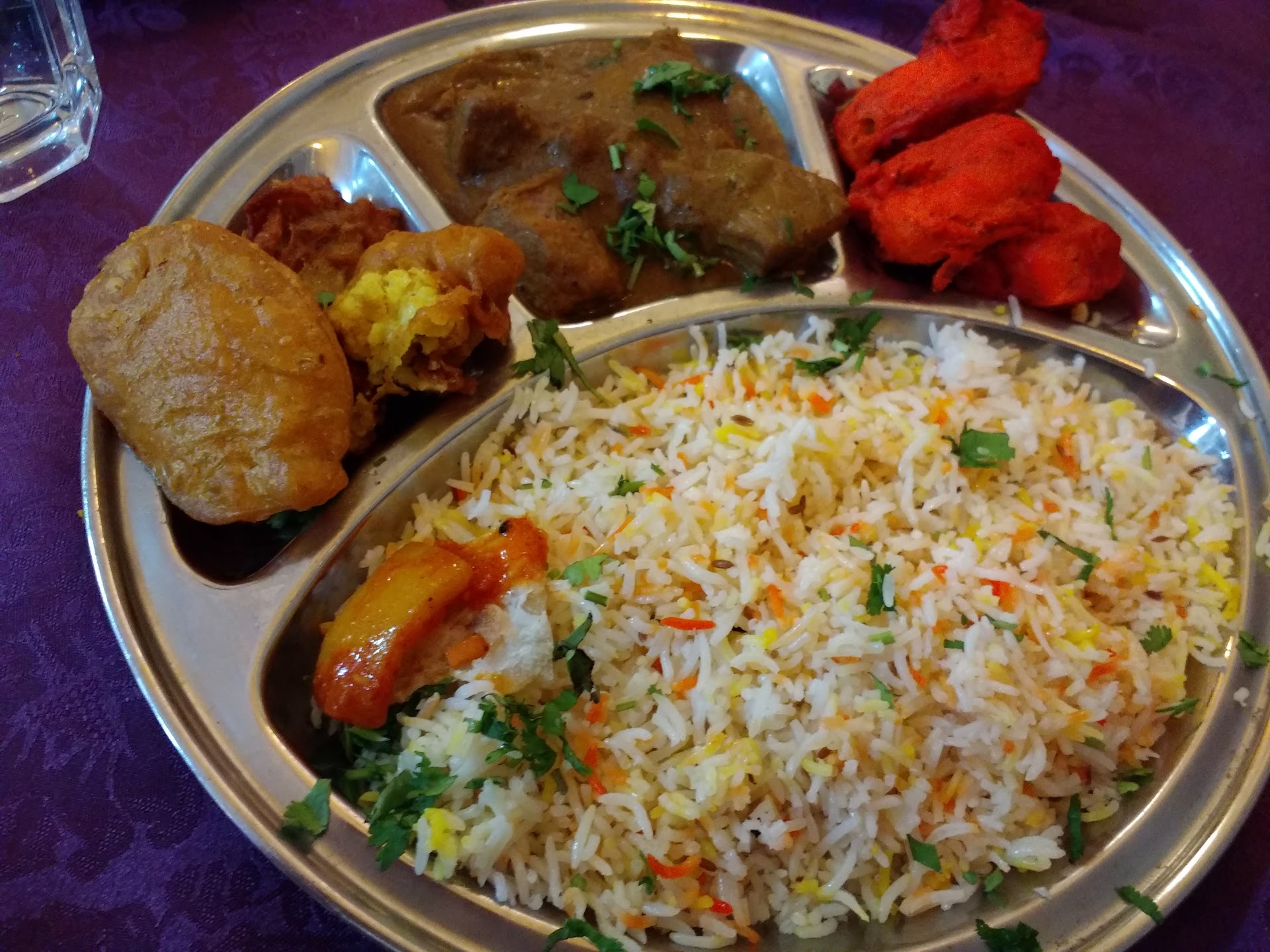 My wife did not need a main course after the starters, but I was looking forward to a chicken dish with curry. I selected the coconut curry chicken dish, which the waiter told me was quite a good choice. The dish had some 5 pieces of chicken white meat in a large amount of curry sauce flavored with visible coconut milk. The flavor of the curry was strong but pleasant; I would rate it about medium on a spicy scale. We also ordered a large portion of basmati rice with Indian herbs, to share. I used the excess curry sauce from my dish on the rice and on the remainder of the potato dumpling.