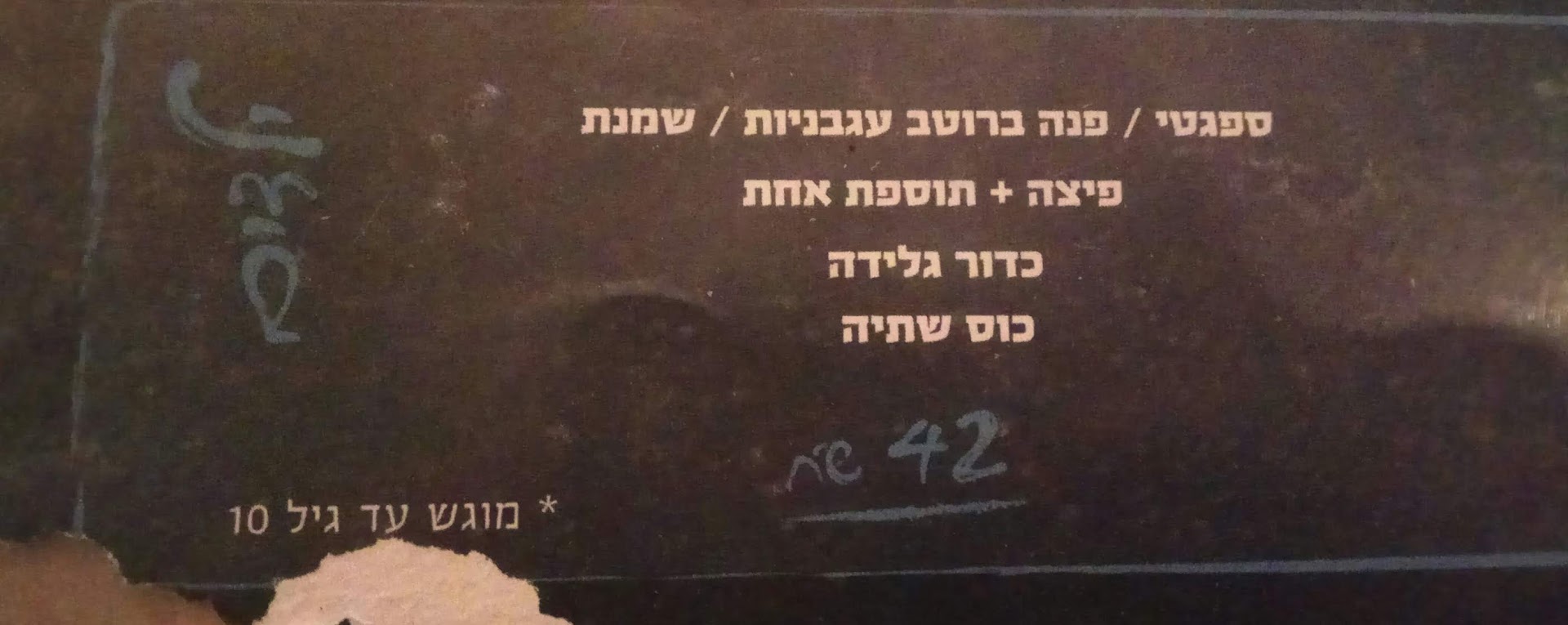 אני חייב גם לציין שהתפריט מאוד משעמם ובנאלי, בסדר שזאת מסעדה איטלקית, ויש פסטה אולה אוליו ופסטה ברוטב אלפרדו ופיצה עם תוספות, אבל הייתי מצפה ממסעדה שמכבדת עצמה לשים בכל קטגוריה לפחות משהו אחד מעניין שלא עושה לך חשק לדפוק את הראש בקיר.