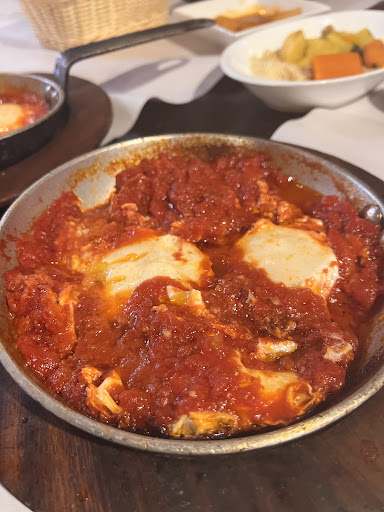 He finally relented and brought us the a la carte menu. We then ordered shakshuka and tap water. The waiter then pretended not to understand "tap water," and then claimed they did not have any and that he could only bring us bottled water. This is a disturbing claim as without tap water I dont know how the restaurant washes dishes.