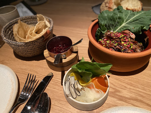 The service was truly outstanding. The waitstaff were friendly, knowledgeable, and adept at describing the dishes. However, there were moments when their formality felt a bit distant, but maybe that's a matter of personal preference. The restaurant's minimalist design, characterized by earthy tones of stone and clay, contributed to the distant atmosphere. The absence of live flowers or greenery felt a bit stark, creating an unexpected contrast between luxury and a barren landscape. Lind of like eating dinner in the middle of Death Valley.