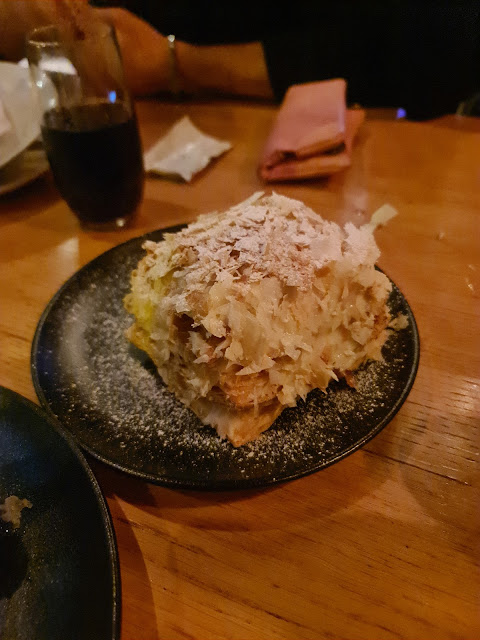The Napoleon cake arrived half an hour to an hour late - apparently, they made it on the spot. The cake arrived with (very) dry layers and was served in a way that is not suitable for serving (not tasty at all).