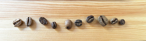 Additionally, the fourth bean from the right has a small hole on its upper half, indicative of insect damage, probably caused by poor storage of the raw beans. Lastly, the upside-down bean in the middle of the image has a small burnt spot at the bottom, known as a scorched bean, which is produced during roasting when the charge temperature (initial temp of the roaster) is too high and the speed of the drum is too slow.